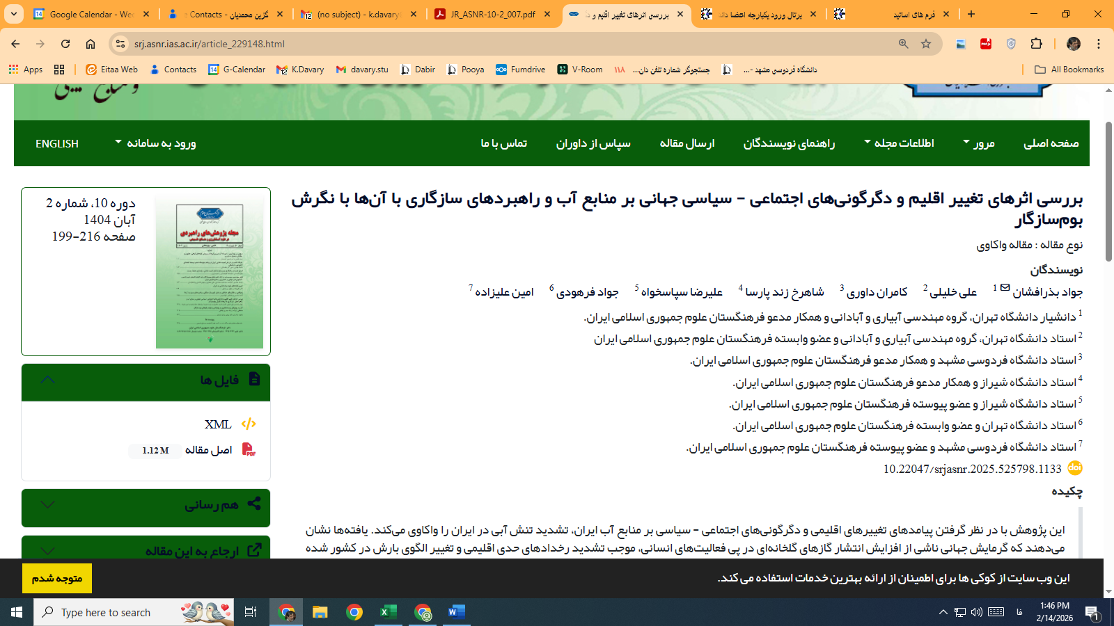 عنوان : ( بررسی اثرهای تغییر اقلیم و دگرگونی اجتماعی سیاسی جهانی بر منابع آب و راهبردهای سازگاری با آن ها با نگرش بوم سازگار )